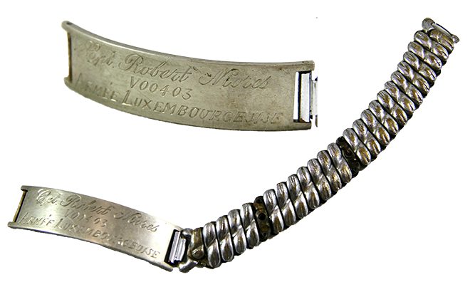 bearing the following inscription: “Cpl. Robert Mores V 00403 Armée Luxembourgeoise”. He was probably wearing the bracelet on the day of his death.