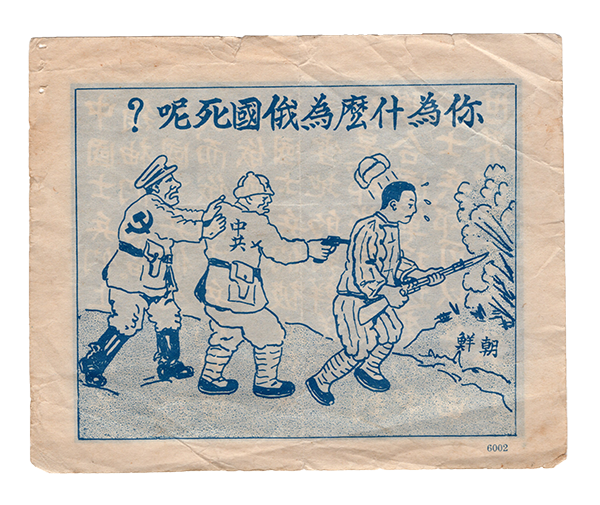 shows a Soviet military commissioner pushing a Chinese officer, who himself is strong-arming a Chinese “volunteer” to storm into battle. Such pamphlets intended to stir up Chinese insubordination by denouncing illegitimate foreign intervention and empowerment.