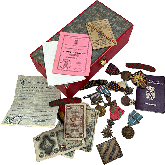 of Marcel Feinen, containing documents, photos, banknotes, coins, medals, ribbons and badges.